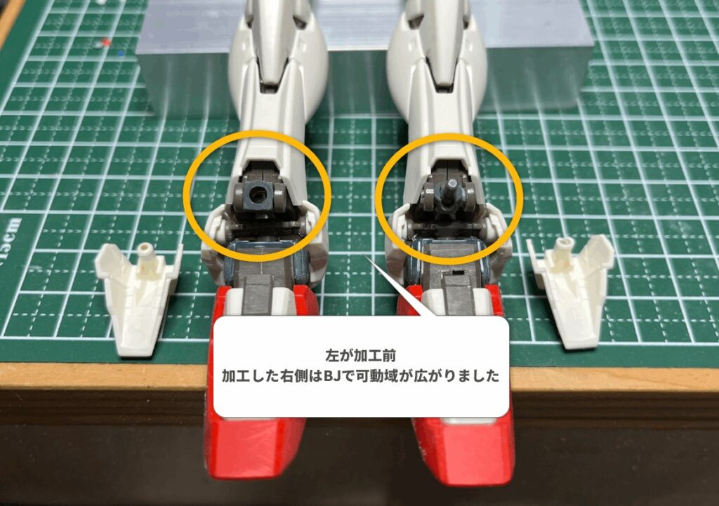こうして足首の甲パーツをBJ化したことで、これまでは干渉して動かなかった「ひねり」の表情が自由自在になります。たった数ミリの可動域拡大ですが、これがポージング全体の「柔らかさ」に直結します。