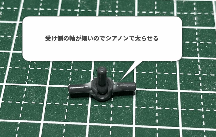 機体側の軸にBJの受けを接続しますが、そのままでは保持力が足りず「スポスポ」の状態です。ここで活躍するのが、高粘度の瞬間接着剤「シアノン」。 軸に薄く塗り広げて「層」を作ることで、軸を太らせ、理想の保持力を生み出します。