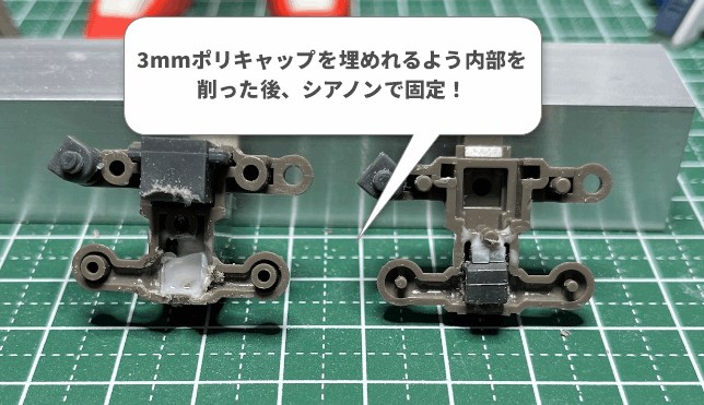 画像のように、内部フレームの干渉箇所を削り、ポリキャップをシアノンでガッチリと固定。このひと手間で、汎用のアクションベースを直接、かつ強固に差し込めるようになります。