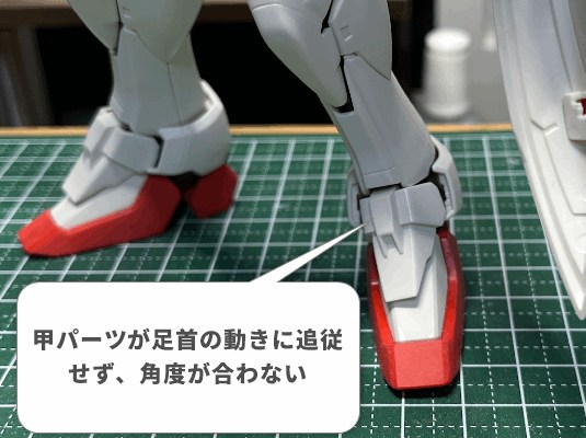 MGウイングVer.Ka(2004年発売)の足首は、デザインこそ秀逸ですが、甲パーツの可動が上下左右に限られている為、足の角度に追随することができません。