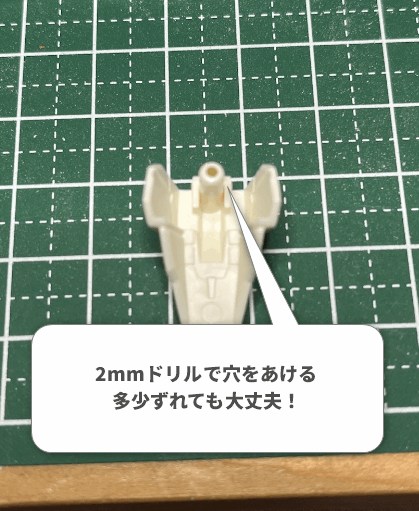 位置を決めたら3mmドリルで貫通穴を開けますが、プラスチックの厚みだけではアクションベースの重さを支えきれません。そこで、内部に「ポリキャップ」を埋め込む工作をプラスします。