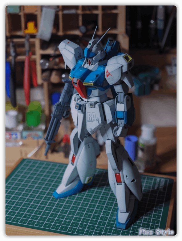 これらを組み合わせることで、「ロンド・ベル隊のエース機」らしい説得力が生まれたと思います。特にシールドや肩のマーキングが良いアクセントになりました。