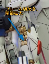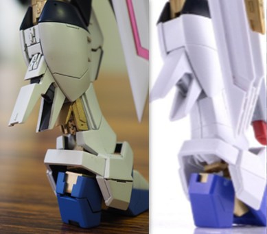 単に伸ばすのではなく、フレームを切欠くことで関節面積が増えていました。それにより視覚的な錯覚を利用して長くスタイリッシュに見せているそうです。 - 膝アーマーの角度変更